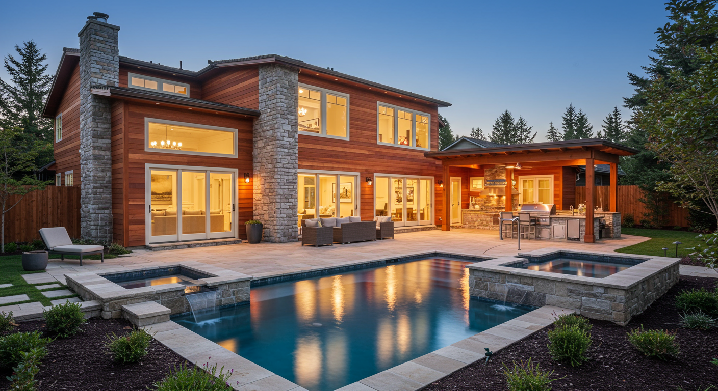 Newly built pool with waterfall features, a spa, outdoor fire pit, and covered loggia with built-in electric heaters and multiple exterior televisions. Outdoor kitchen with built-in BBQ, sink, and refrigerator. This home is a must-see.